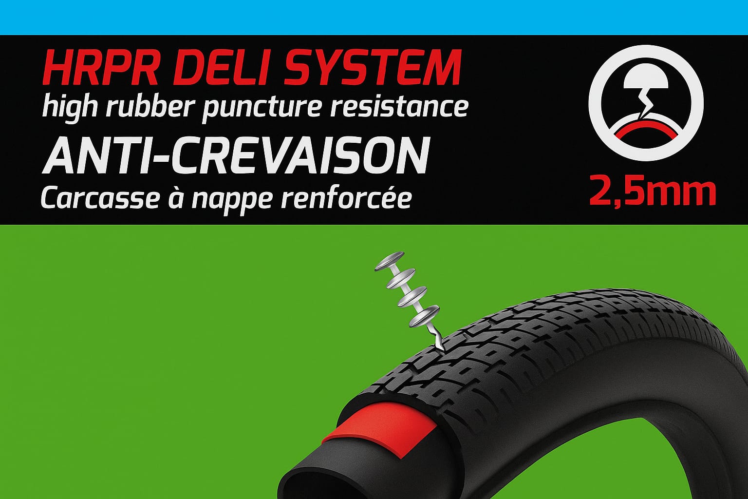Le pneu Deli 700 x 40C VAE E25 Deliride est équipé d’une bande anti-crevaison de 2,5 mm et de flancs réfléchissants pour améliorer la sécurité en conditions urbaines. Il dispose d’un profil SA-320 adapté aux vélos électriques jusqu’à 25 km/h, offrant une bonne adhérence et un roulement efficace. Son format ETRTO 42-622 le rend compatible avec de nombreuses jantes route ou trekking.